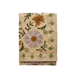Dette kunstferdige teppet fra Madam Stoltz er laget i myk bomull og dekorert med detaljert Suzani-broderi – et tradisjonelt persisk mønster kjent for sine ornamentale former og håndverksrike uttrykk.
